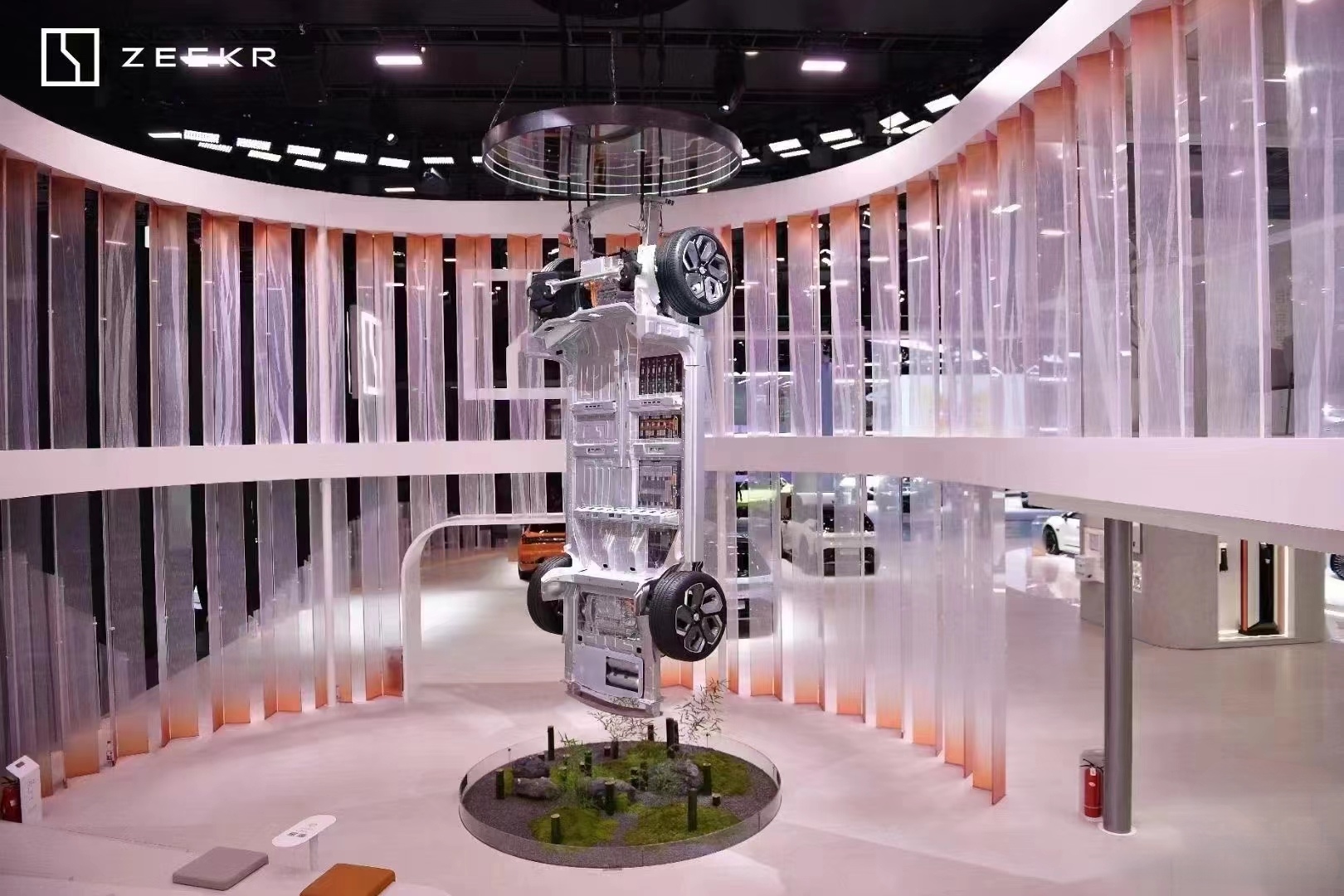開闊通透的空間設(shè)計:極氪展臺采用開闊通透的空間設(shè)計,打破傳統(tǒng)車展展臺的封閉感,增強(qiáng)了視野通透感。這種設(shè)計讓觀眾能夠更加自由地瀏覽和欣賞展品,同時也提升了展臺的整體美感和舒適度。