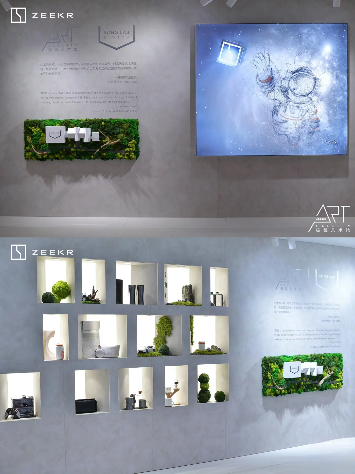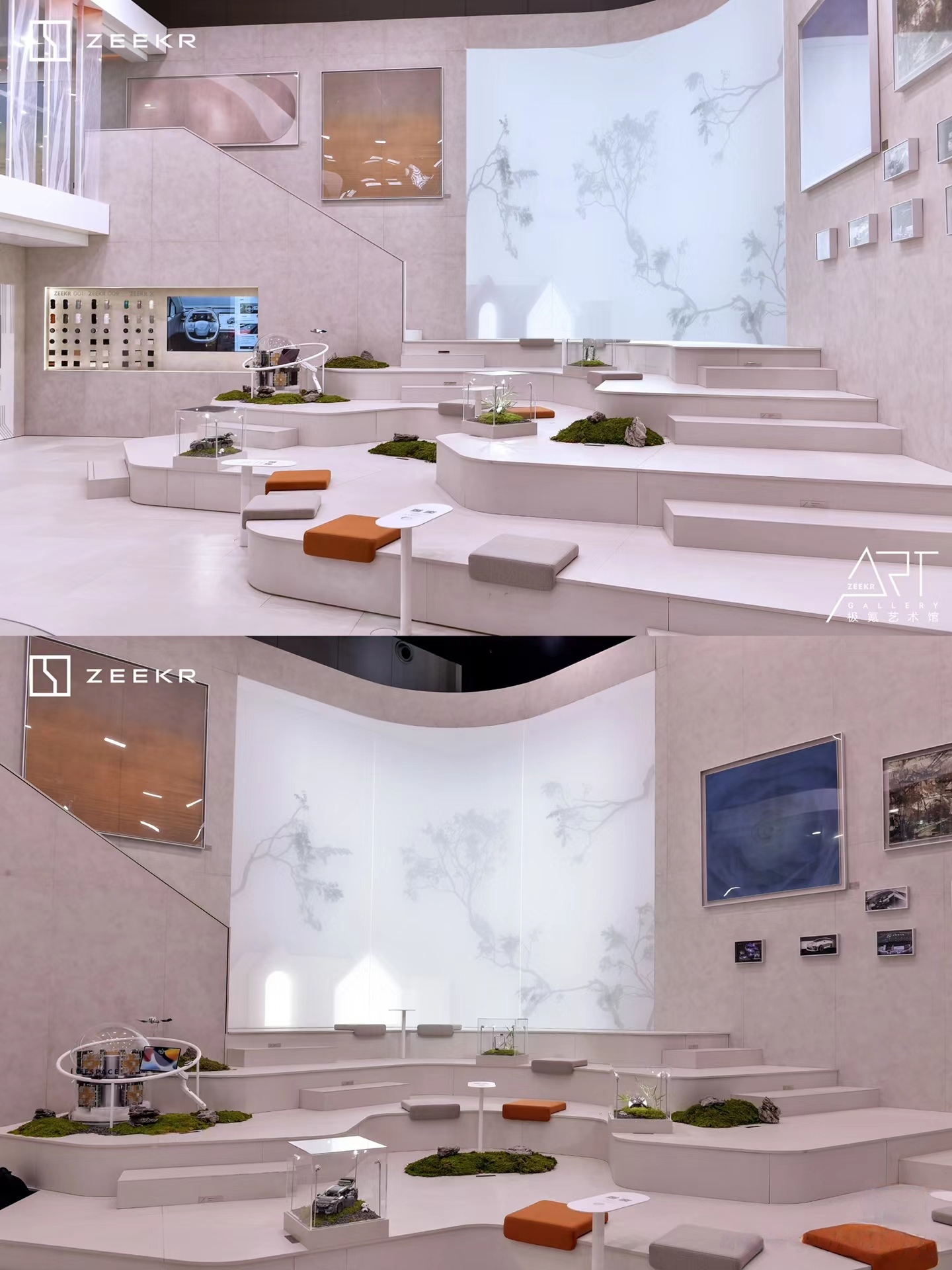 跨界合作藝術(shù)館式展臺:極氪展臺與松美術(shù)館共同設(shè)計,延續(xù)了“藝術(shù)館”的風(fēng)格,將科技與藝術(shù)完美融合,共同打造出一個充滿藝術(shù)氣息的科技空間。這種跨界合作不僅提升了展臺的藝術(shù)價值,還拓寬了品牌的文化內(nèi)涵,為觀眾帶來獨(dú)特的視覺享受和沉浸式體驗(yàn)。這種設(shè)計不僅展現(xiàn)了極氪品牌的先鋒創(chuàng)新之美,還通過藝術(shù)手段增強(qiáng)了品牌與用戶的互動和共鳴。