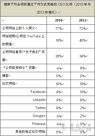與2010年相比,2012年全球CEO的網(wǎng)絡(luò)社交力有了明顯的提升,這主要表現(xiàn)在CEO通過(guò)公司網(wǎng)站與視頻形式參與網(wǎng)絡(luò)社交的百分比的提高(公司網(wǎng)站由32%提高到50%,視頻由18%提高到40%)。而在企業(yè)網(wǎng)站上出現(xiàn)的有關(guān)CEO的信息中有50%主要出現(xiàn)在公司首頁(yè)和“關(guān)于我們”的頁(yè)面(例如致信、圖片或視頻),和以往相比,除了CEO姓名外,還增加了更多其他的信息與內(nèi)容。采用公司網(wǎng)站來(lái)添加有關(guān)CEO的介紹是讓CEO參與網(wǎng)絡(luò)社交的第一步,也是在部分國(guó)際市場(chǎng)上進(jìn)行網(wǎng)絡(luò)社交的主要手段。亞太地區(qū)的CEO利用企業(yè)網(wǎng)站進(jìn)行社交的比例最高(55%),而美國(guó)的比例為53%,歐洲為48%。