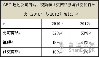 萬(wàn)博宣偉公關(guān)公司一項(xiàng)新的調(diào)查顯示全球大公司CEO的網(wǎng)絡(luò)社交力較前兩年有大幅提升。2010年萬(wàn)博宣偉首次針對(duì)世界五十強(qiáng)企業(yè)的CEO開展的有關(guān)CEO網(wǎng)絡(luò)社交參與度的調(diào)查(《讓CEO參與社交:由不善交際變得善于交際》)結(jié)果顯示,有36%的CEO參與網(wǎng)絡(luò)社交,而2012年的調(diào)查結(jié)果為66%。