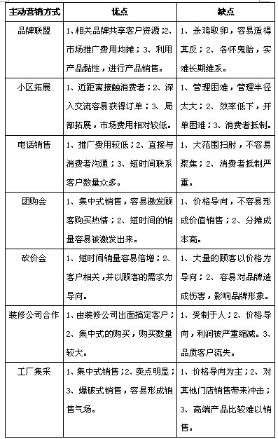 設(shè)計(jì)師通路、裝修公司、團(tuán)購會(huì)、砍價(jià)會(huì)、工廠集采等方式。作為主動(dòng)營銷的最主要的特征就是,用積極的方法去主動(dòng)尋找和開發(fā)客戶,并最終達(dá)到成交的目的。