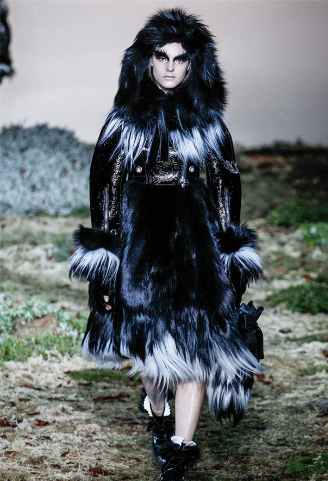 1,T臺無形勝過有形?。耘_可以變?yōu)椴莸貢缫?,如電影中叢林女神幽靈掠過,呵呵,美女和野獸,一個狂野唯美的童話。亞歷山大·麥昆 (Alexander McQueen) 2014秋冬女裝秀的地板被布置成長滿苔蘚、石南的森林綠地,模特們穿著山羊皮、臭鼬毛皮和狐貍皮的外套遠遠走來,體積龐大如同笨重的北極熊。16、17世紀宮廷風格的泡泡袖、高領(lǐng)、束腰裝飾和白色網(wǎng)眼裙又讓這些耳鬢兩縷長發(fā)的模特像從遠古穿越而來一般的疏離。