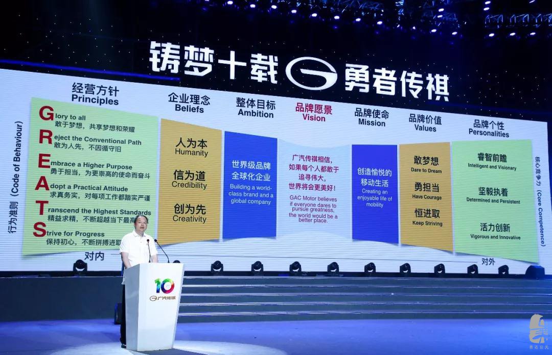 為了實(shí)現(xiàn)這一使命,廣汽傳祺也制定了指導(dǎo)企業(yè)經(jīng)營(yíng)事業(yè)的基本原則——企業(yè)經(jīng)營(yíng)方針。其六項(xiàng)企業(yè)經(jīng)營(yíng)方針是:敢于夢(mèng)想,共享夢(mèng)想和榮耀;敢為人先,不因循守舊;勇于擔(dān)當(dāng),為更崇高的使命而奮斗;求真務(wù)實(shí),對(duì)每一項(xiàng)工作都踏實(shí)嚴(yán)謹(jǐn);精益求精,不斷超越當(dāng)下最高標(biāo)準(zhǔn);保持初心,不斷拼搏進(jìn)取。這六個(gè)方針與“敢夢(mèng)想、勇?lián)?dāng)、恒進(jìn)取”的品牌價(jià)值觀對(duì)應(yīng),凝結(jié)著廣汽傳祺企業(yè)文化核心精神,其英文首字母,連起來(lái)正是GREATS一詞,廣汽傳祺希望通過(guò)簡(jiǎn)易好記的方式,鼓勵(lì)每一位傳祺人,和認(rèn)同這一理念的人一起,每天踐行品牌愿景。