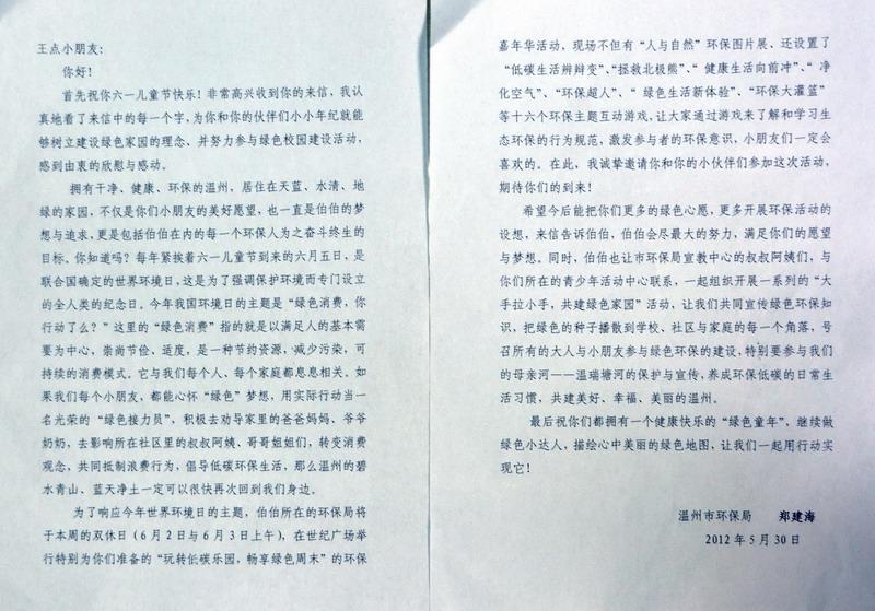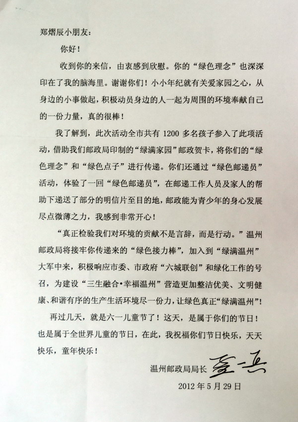 在“綠滿家園”賀卡寄出不久后,隊長學校紛紛收到了領(lǐng)導回信,對孩子們在少年兒童小小年級就能夠樹立建設(shè)綠色校園的理念,并努力參與綠色校園建設(shè)活動,感到由衷的欣慰和感動。其中市環(huán)保局局長鄭建海在給隊長學校王點同學的回信中希望大家都能擁有一個健康快樂的“綠色童年”,能繼續(xù)做綠色小達人,描繪心中美麗的綠色地圖。市郵政局局長孟一兵在給鄭熠辰同學的回信中提到溫州郵政局將接牢你傳遞來的“綠色接力棒”,加入到“綠滿溫州”大軍中來,為營造更加整潔優(yōu)美、文明健康、和諧有序的生產(chǎn)生活環(huán)境盡一份力,讓綠色真正“綠滿溫州”。