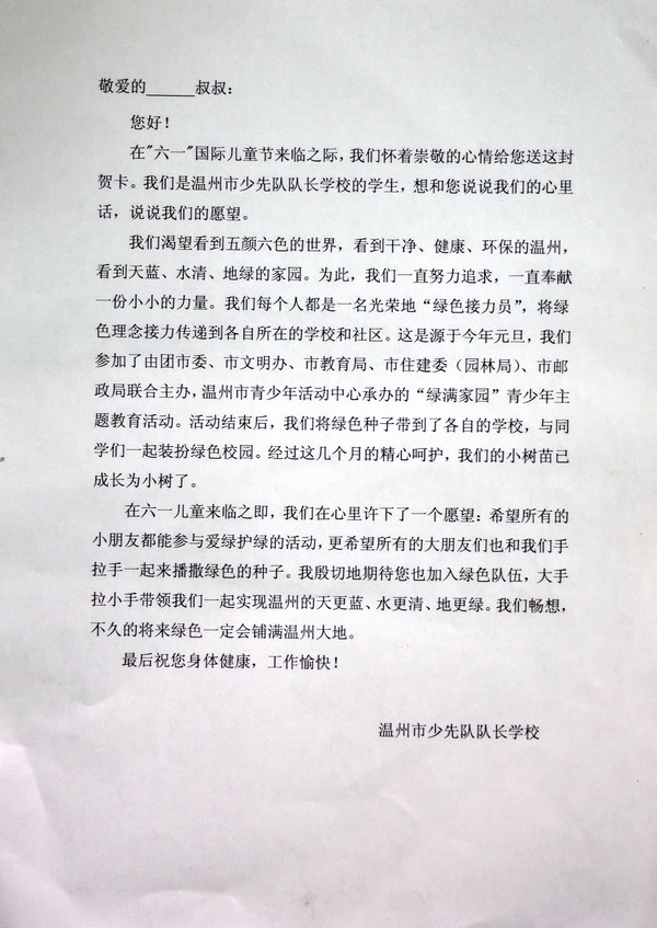 為讓綠色理念傳遞到全市各個角落,讓每個人光榮地成為“綠色接力員”,共建“綠滿家園”,在“六•一”國際兒童節(jié)來臨之時,溫州市第三屆少先隊隊長學校學員代表向全市30余名市級領(lǐng)導寄送“綠滿家園”賀卡,畫上“綠色”金點子或理念,并說出自己的六一心愿,希望所有的小朋友都能參與愛綠護綠的活動,更希望所有的大朋友們也和少年兒童手拉手一起來播撒綠色的種子,一起實現(xiàn)溫州的天更藍、水更清、地更綠的心愿。