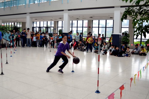 4月21日上午,籃球班60多名學(xué)員在老師們的組織下在中心一樓大廳舉行了趣味籃球賽活動(dòng)。首先進(jìn)行的是運(yùn)球過障礙比賽,活動(dòng)策劃,在裁判員的一聲哨響之后,學(xué)員們排成了一條長(zhǎng)龍,沿著標(biāo)桿魚貫而入式的運(yùn)球表演贏得了在場(chǎng)家長(zhǎng)學(xué)員們的陣陣掌聲。中場(chǎng)休息的時(shí)候,一位學(xué)員的轉(zhuǎn)球表演秀更是將比賽帶入了高潮。