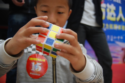 雖然比賽現(xiàn)場嘈雜,但每位選手拿起魔方后,注意力變得高度集中,他們神情自若,十指若飛,擰著魔方稀里嘩啦一陣狂轉,速度之快讓人眼花繚亂,別人還未看出門道來,六色小方塊各歸一色地聚攏在各自的平面上,現(xiàn)場觀眾嘆為觀止。