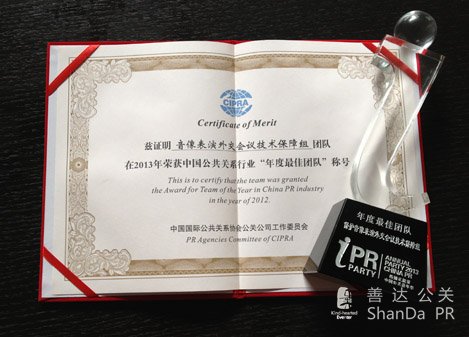 在剛剛結(jié)束的中國國際公共關(guān)系協(xié)會(huì)(CIPRA)舉辦的2012年度行業(yè)獎(jiǎng)項(xiàng)評(píng)選中,中青旅聯(lián)科公關(guān)公司“保護(hù)音像表演外交會(huì)議技術(shù)保障組”因其在該項(xiàng)目中的出色表現(xiàn),榮獲2012年度最佳團(tuán)隊(duì)獎(jiǎng)。