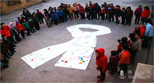 山西五臺縣黑崖堂小學(xué)130多名師生和凱維公關(guān)的愛心大使共同繪制巨型“夢想圍脖”。