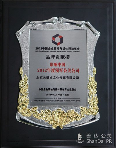 12月20日,第四屆(2012)中國企業(yè)領(lǐng)袖與媒體領(lǐng)袖年會在北京康源瑞廷酒店隆重舉行。本屆年會由中國廣告主協(xié)會、中國人民大學(xué)新聞學(xué)院、中國傳媒大學(xué)廣告學(xué)院共同主辦,大會以“融合與促進(jìn)——融合推動發(fā)展,促進(jìn)創(chuàng)造價值”為主題,是年內(nèi)中國企業(yè)界與媒體界聯(lián)合會議中規(guī)格最高、規(guī)模最大、影響最廣的標(biāo)志性活動。大會發(fā)布年度品牌貢獻(xiàn)榜,關(guān)鍵點(diǎn)傳媒、萬博宣偉、偉達(dá)等四家20121123224.html">公司榮獲“影響中國2012年度領(lǐng)軍公關(guān)公司”殊榮。其中,關(guān)鍵點(diǎn)傳媒位列首位。