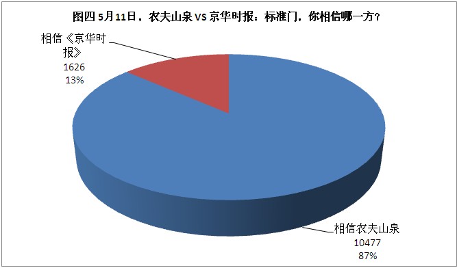 5月7日《京華時報》最后一次大規(guī)模報道標(biāo)準(zhǔn)事件后,微博里絕大多數(shù)議論標(biāo)準(zhǔn)門事件的網(wǎng)友開始傾向農(nóng)夫山泉,并對《京華時報》的報道態(tài)度產(chǎn)生質(zhì)疑,更有甚者開始懷疑其報道動機。