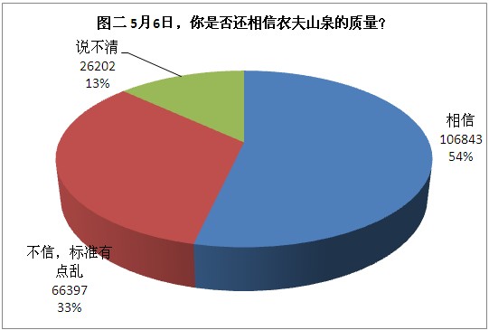 5月8日,又一期網(wǎng)絡(luò)調(diào)查顯示,已經(jīng)有近八成的網(wǎng)民相信農(nóng)夫山泉沒有問題。(見圖三)