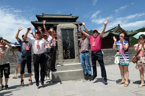 7月28日,前來參觀考察的勞動模范在北京居庸關長城上留影。當日,首批共200名全國勞動模范齊聚北京、北戴河集中休養(yǎng),正式啟動2013全國勞模休養(yǎng)活動。首批勞模休養(yǎng)活動從7月27日持續(xù)至8月2日,除在北京參觀考察外,勞模們還將前往北戴河度過一個難忘的假期。中華全國總工會于7月至11月期間,組織5000名勞模分33批前往北戴河、青島、廈門等11個休養(yǎng)基地“度假”。這是全國總工會開展勞模休養(yǎng)活動以來人數(shù)最多的一次。新華社記者 何俊昌 攝