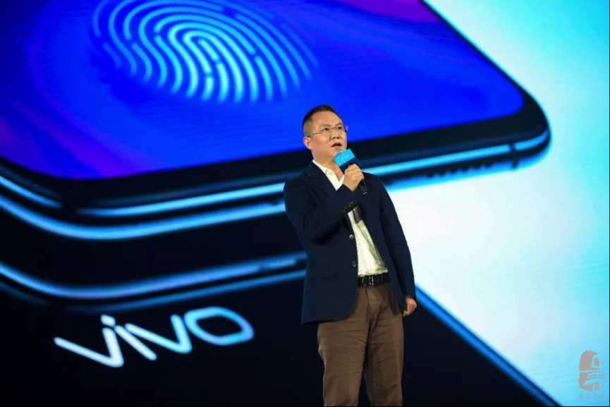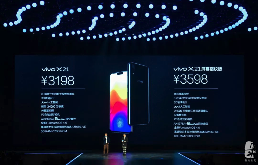 vivo高級副總裁倪旭東先生在巨型“指紋”映襯之下宣布全新X21的銷售價格。