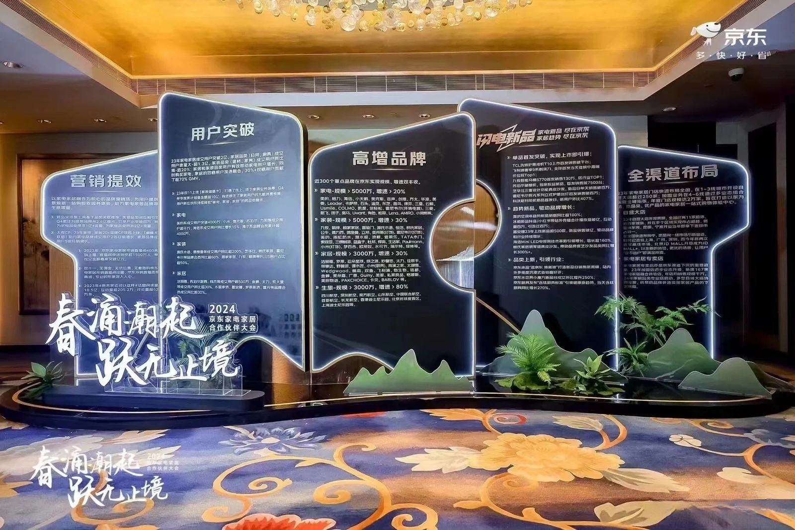 主題與裝飾:與活動(dòng)現(xiàn)場(chǎng)的主題“春涌潮起 躍無止境”相呼應(yīng),強(qiáng)調(diào)京東家電家居業(yè)務(wù)的蓬勃發(fā)展和持續(xù)創(chuàng)新。 裝飾方面,可能會(huì)采用簡(jiǎn)潔而現(xiàn)代的設(shè)計(jì)風(fēng)格,融入京東的品牌元素,營(yíng)造出專業(yè)而充滿活力的氛圍。