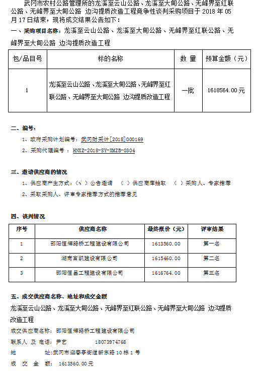 龍溪至云山公路、龍溪至大甸公路、無峰界至紅聯(lián)公路、無峰界至大甸公路 邊溝提質(zhì)改造工程競(jìng)爭(zhēng)性談判成交結(jié)果公告
