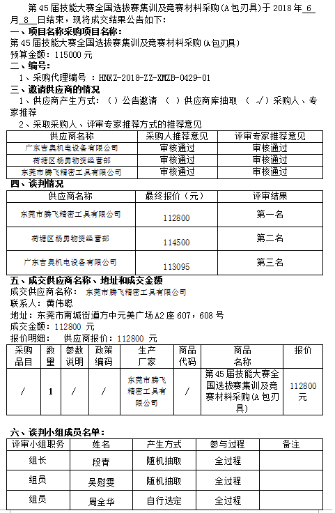 第45屆技能大賽全國(guó)選拔賽集訓(xùn)及競(jìng)賽材料采購(gòu) (A包刃具) 競(jìng)爭(zhēng)性談判成交公告