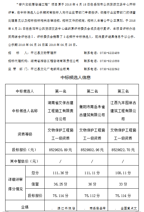 李六如故居修繕工程項(xiàng)目中標(biāo)候選人復(fù)評公示