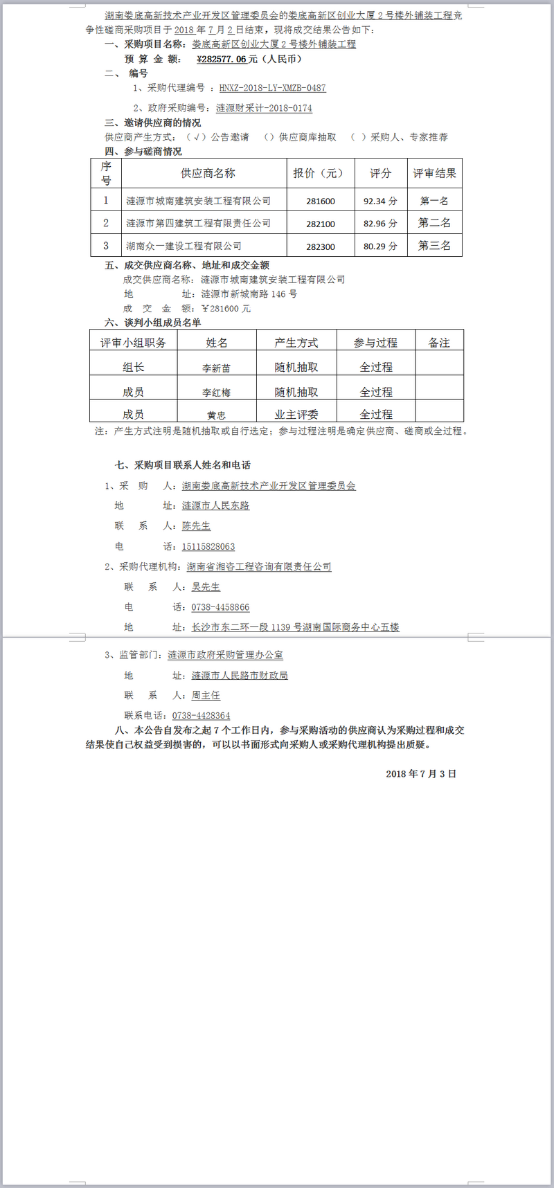 婁底高新區(qū)創(chuàng)業(yè)大廈2號樓外鋪裝工程競爭性磋商成交結(jié)果公告