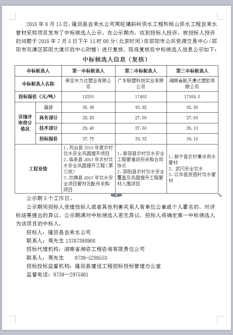 隆回縣自來水公司周旺鎮(zhèn)斜嶺供水工程和桃山供水工程自來水管材采購項目招標(biāo)投標(biāo)信息公示表(復(fù)核)