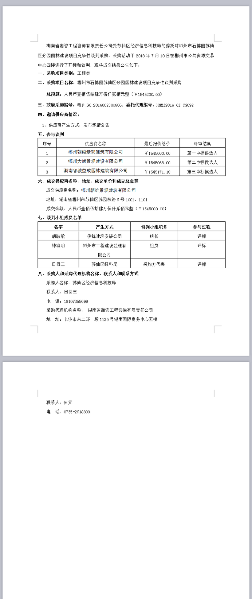 郴州市石博園蘇仙區(qū)分園園林建設項目競爭性談判采購成交公告