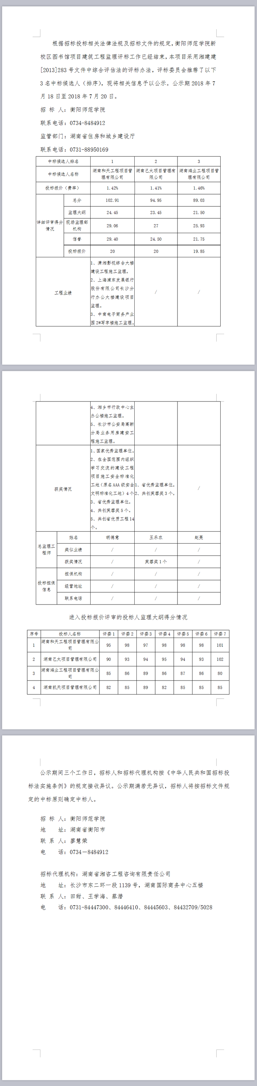 衡陽師范學院新校區(qū)圖書館項目建筑工程監(jiān)理招標投標信息公示表