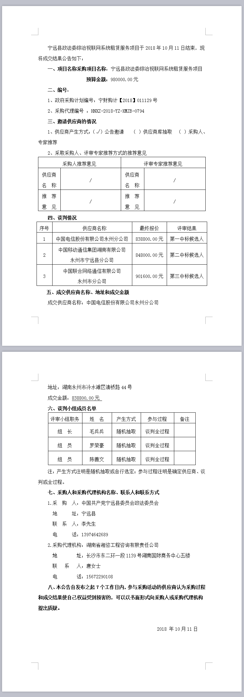 寧遠(yuǎn)縣政法委綜治視聯(lián)網(wǎng)系統(tǒng)租賃服務(wù)項目 競爭性談判成交結(jié)果公告