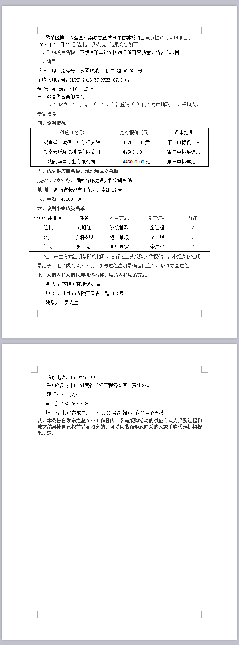 零陵區(qū)第二次全國污染源普查質(zhì)量評估委托項(xiàng)目競爭性談判成交公告