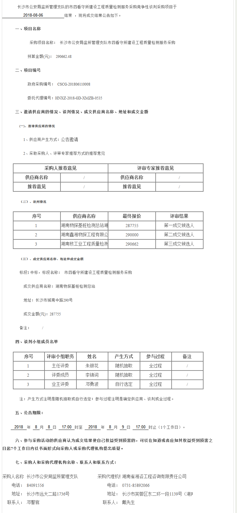 長(zhǎng)沙市公安局監(jiān)所管理支隊(duì)市四看守所建設(shè)工程質(zhì)量檢測(cè)服務(wù)采購(gòu)結(jié)果公告