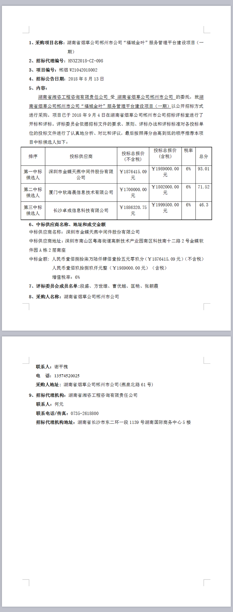 湖南省煙草公司郴州市公司“福城金葉”服務(wù)管理平臺 建設(shè)項目(一期)中標結(jié)果公示