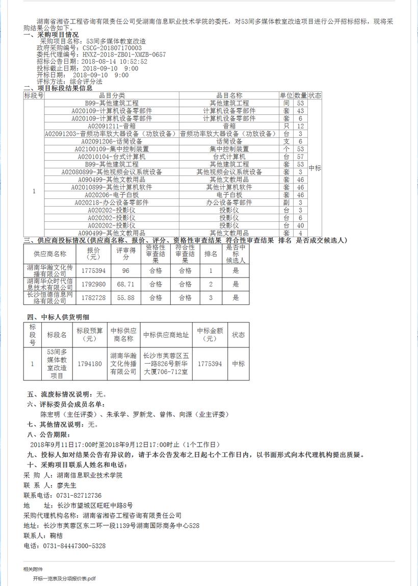 湖南信息職業(yè)技術(shù)學(xué)院53間多媒體教室改造結(jié)果公告