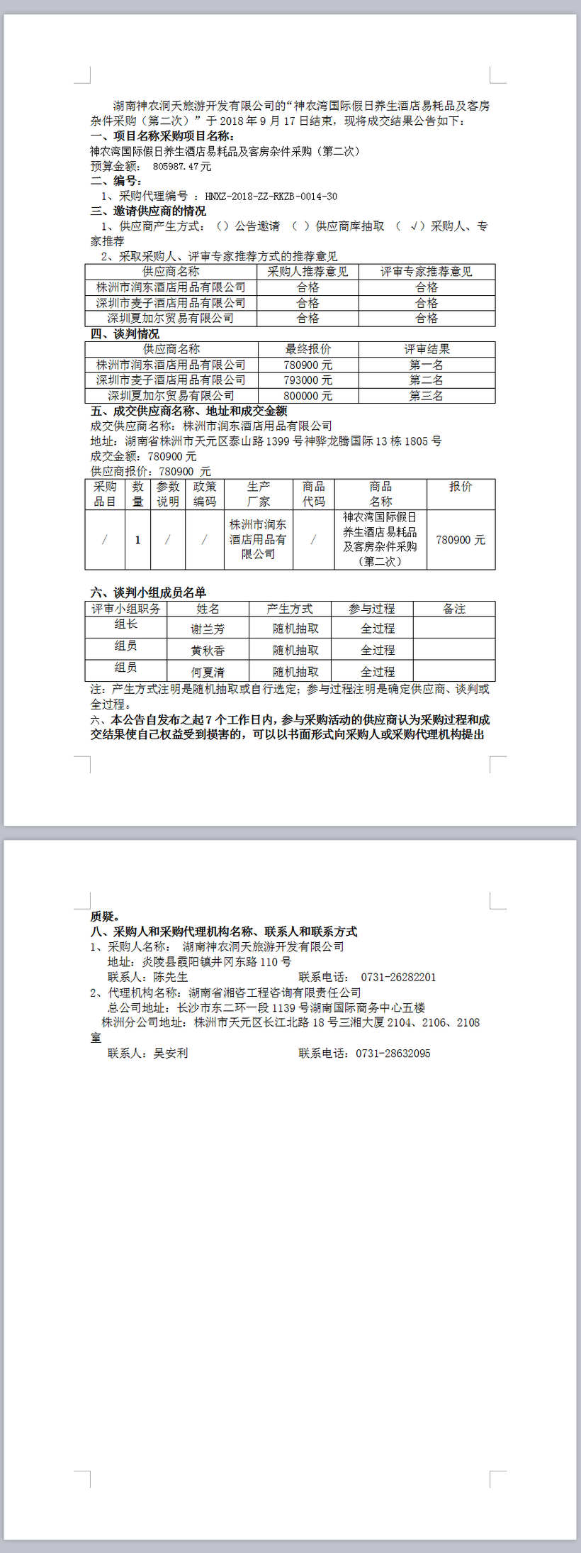 神農(nóng)灣國際假日養(yǎng)生酒店易耗品及客房雜件采購(第二次)競爭性談判成交公告