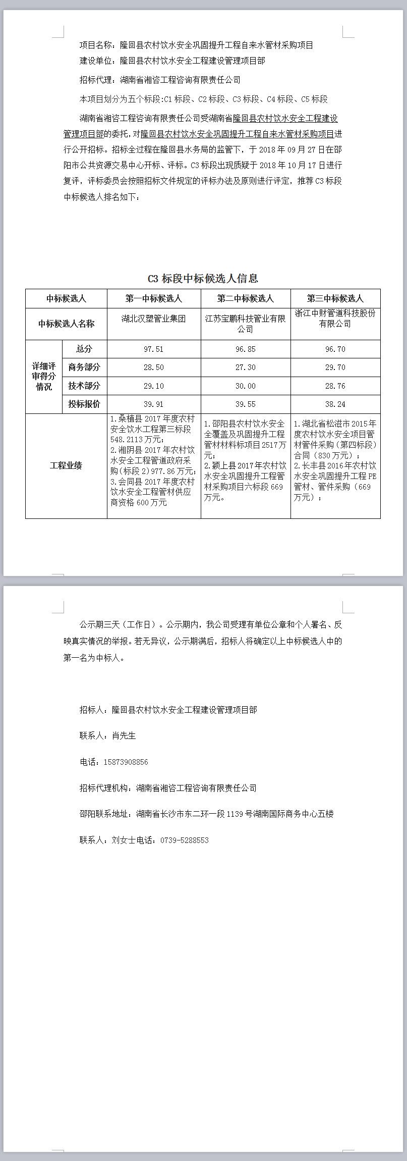 隆回縣農(nóng)村飲水安全鞏固提升工程自來水管材采購項目招標投標信息公示表(C3標段復評)