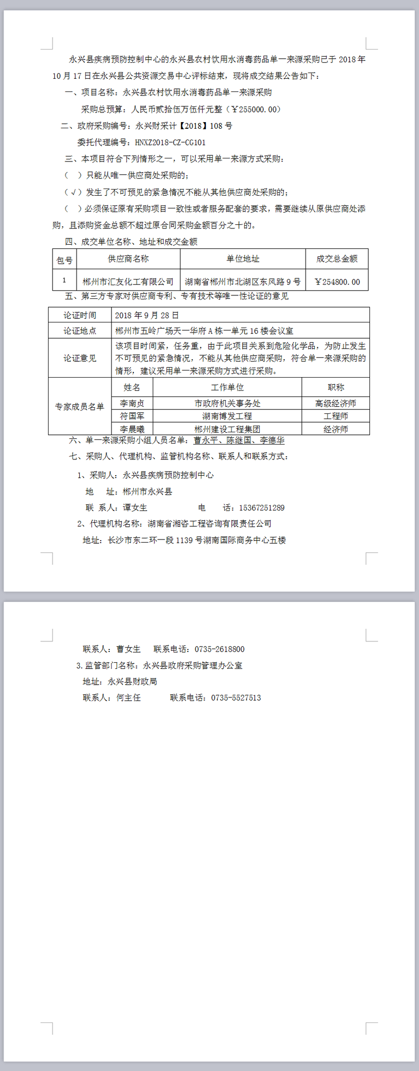 永興縣農(nóng)村飲用水消毒藥品單一來源采購成交公告
