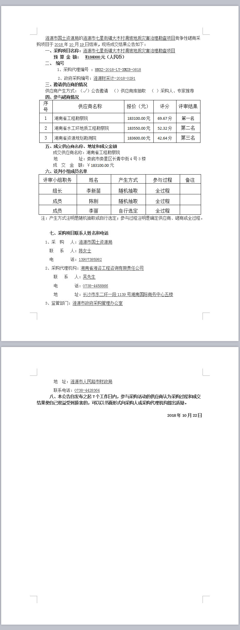 漣源市七星街鎮(zhèn)大木村滑坡地質(zhì)災(zāi)害治理勘查項(xiàng)目競(jìng)爭(zhēng)性磋商成交結(jié)果公告