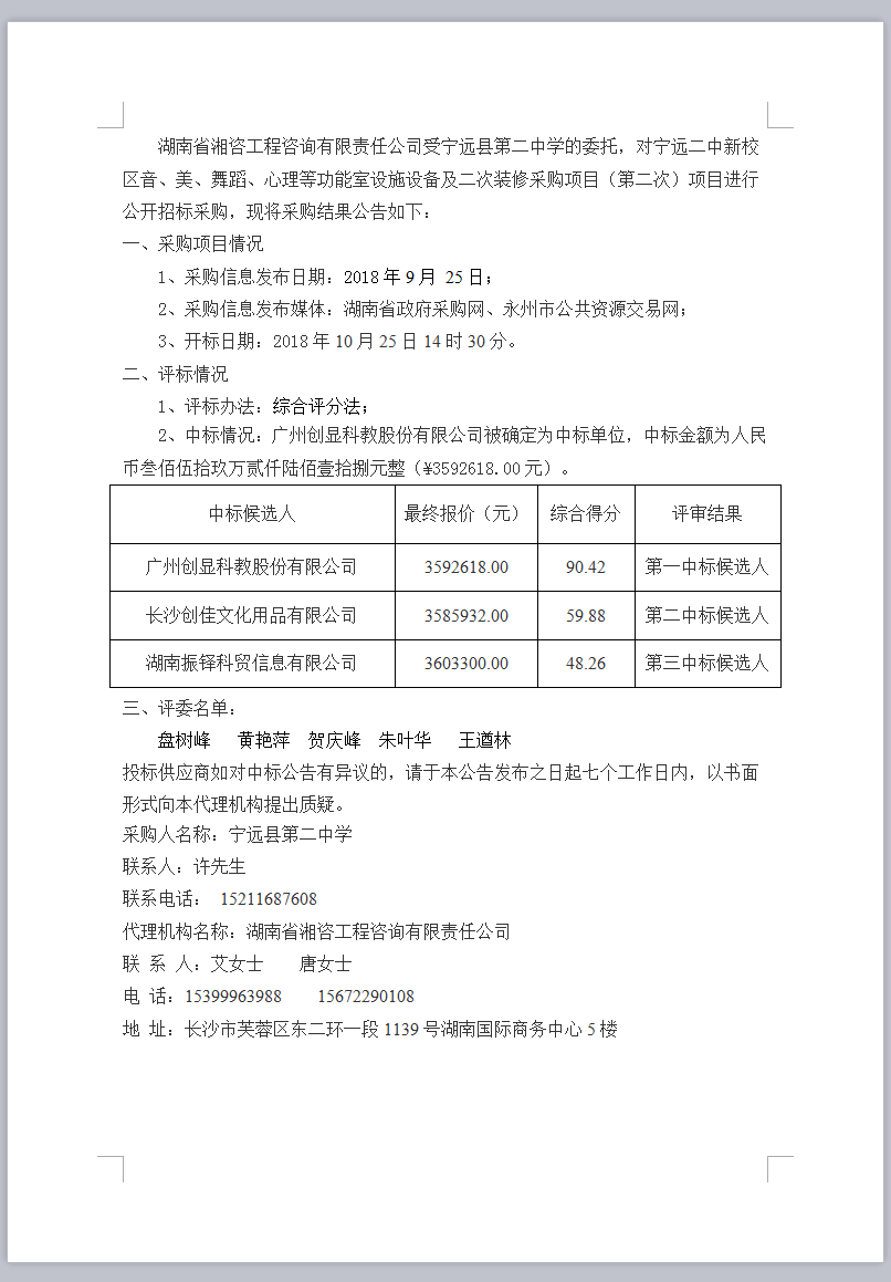 寧遠(yuǎn)二中新校區(qū)音、美、舞蹈、心理等功能室設(shè)施設(shè)備及二次裝修采購項(xiàng)目中標(biāo)公告