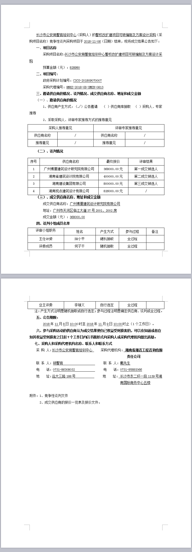長沙市公安局警官培訓中心警校改擴建項目可研編制及方案設(shè)計采購競爭性談判成交結(jié)果公告