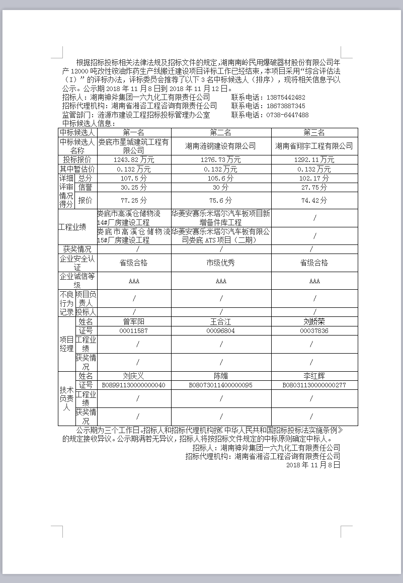 湖南南嶺民用爆破器材股份有限公司年產(chǎn)12000噸改性銨油炸藥生產(chǎn)線搬遷建設(shè)項(xiàng)目中標(biāo)候選人公示