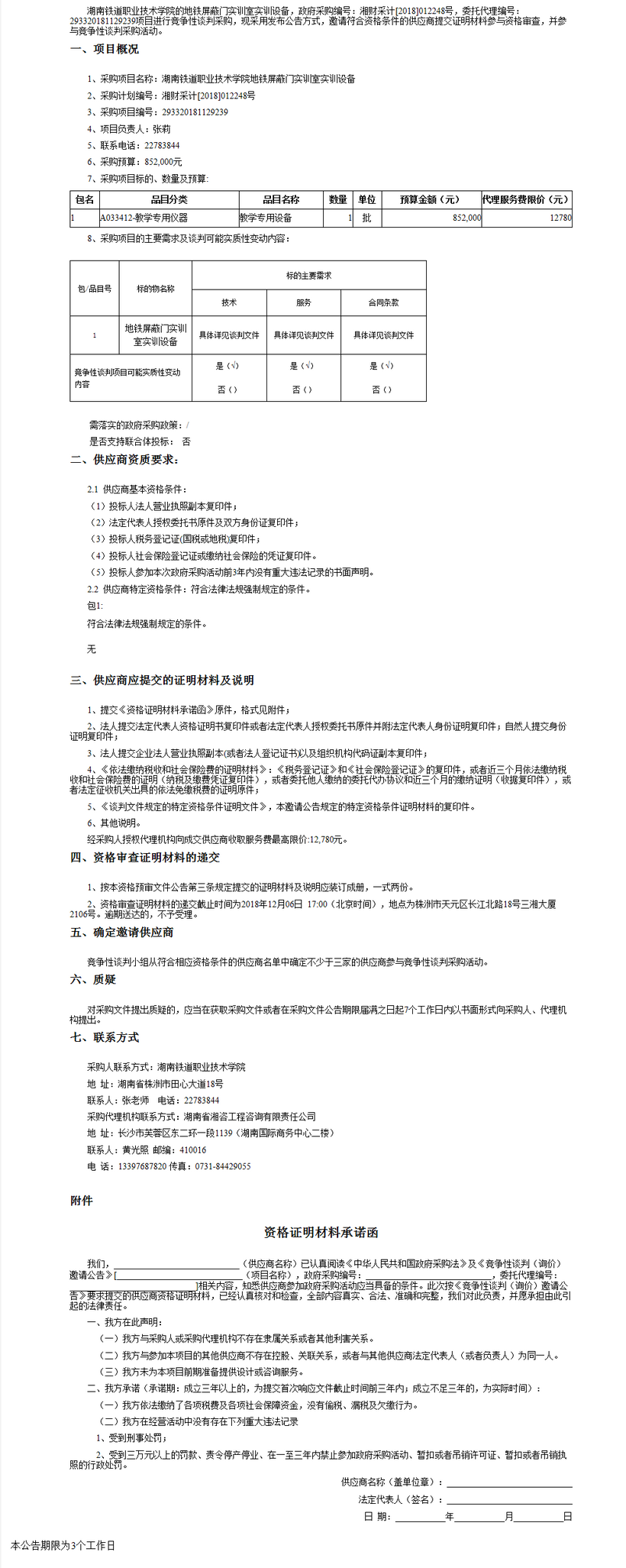 湖南鐵道職業(yè)技術學院地鐵屏蔽門實訓室實訓設備項目競爭性談判邀請公告