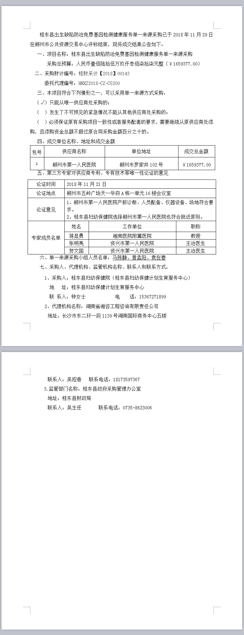 桂東縣出生缺陷防治免費基因檢測健康服務單一來源采購成交公告