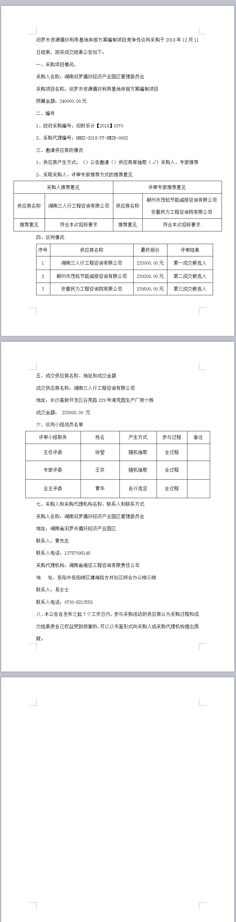 湖南汨羅循環(huán)經(jīng)濟(jì)產(chǎn)業(yè)園區(qū)管理委員會(huì)競(jìng)爭(zhēng)性談判成交結(jié)果公告