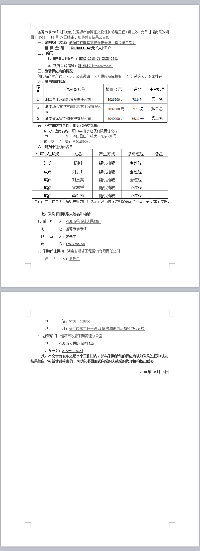 漣源市存厚堂文物保護修繕工程(第二次) 競爭性磋商成交結(jié)果公告
