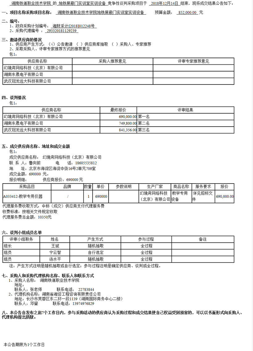 湖南鐵道職業(yè)技術(shù)學(xué)院地鐵屏蔽門實(shí)訓(xùn)室實(shí)訓(xùn)設(shè)備競爭性談判成交公告