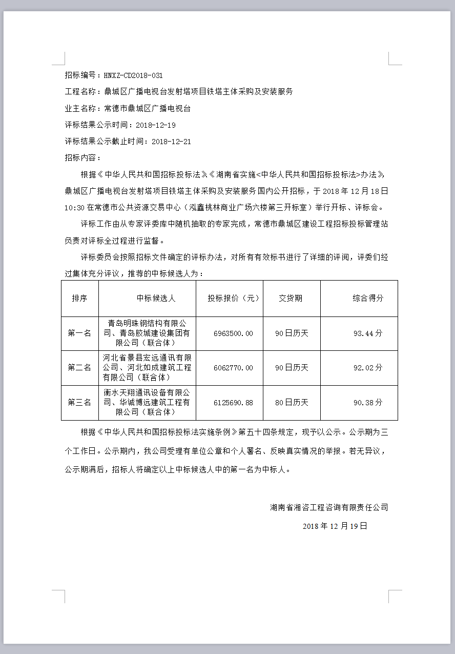 鼎城區(qū)廣播電視臺發(fā)射塔項目鐵塔主體采購及安裝服務(wù)中標(biāo)候選人公示