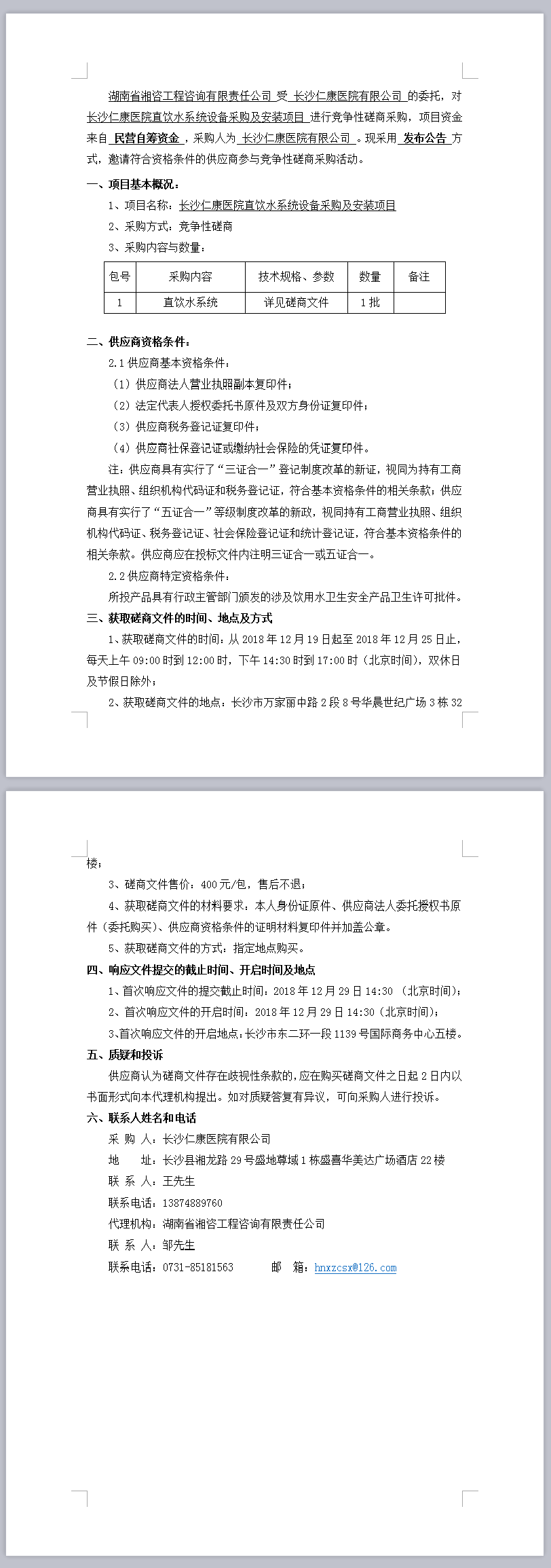 長沙仁康醫(yī)院直飲水系統(tǒng)設(shè)備采購及安裝項目磋商邀請公告