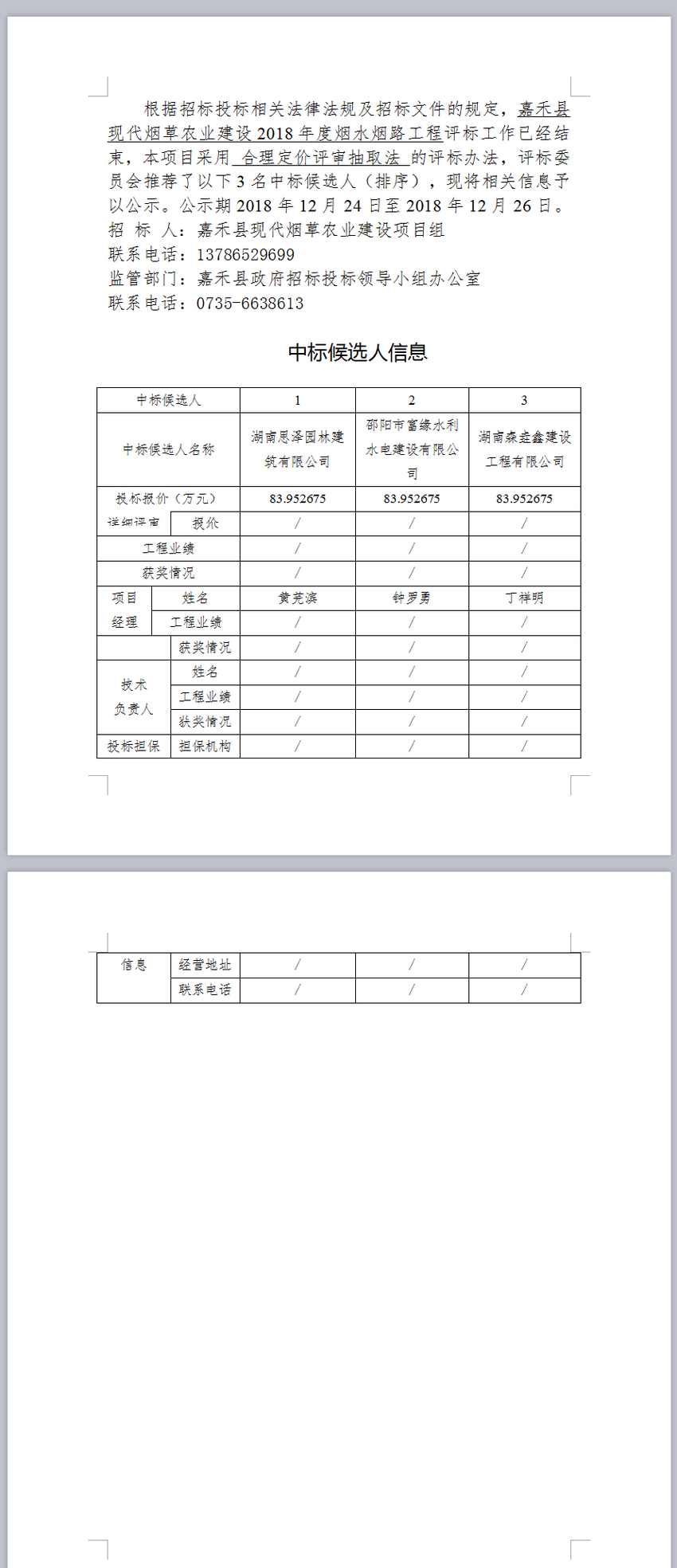 嘉禾縣現(xiàn)代煙草農(nóng)業(yè)建設(shè)2018年度煙水煙路工程中標(biāo)候選人公示