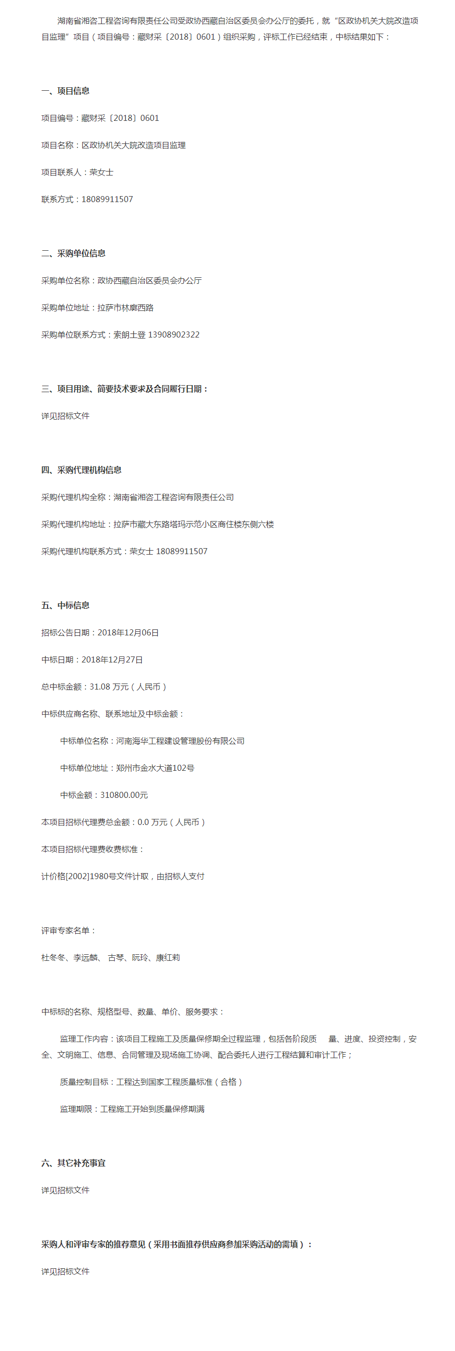 政協(xié)西藏自治區(qū)委員會(huì)辦公廳區(qū)政協(xié)機(jī)關(guān)大院改造項(xiàng)目監(jiān)理中標(biāo)公告