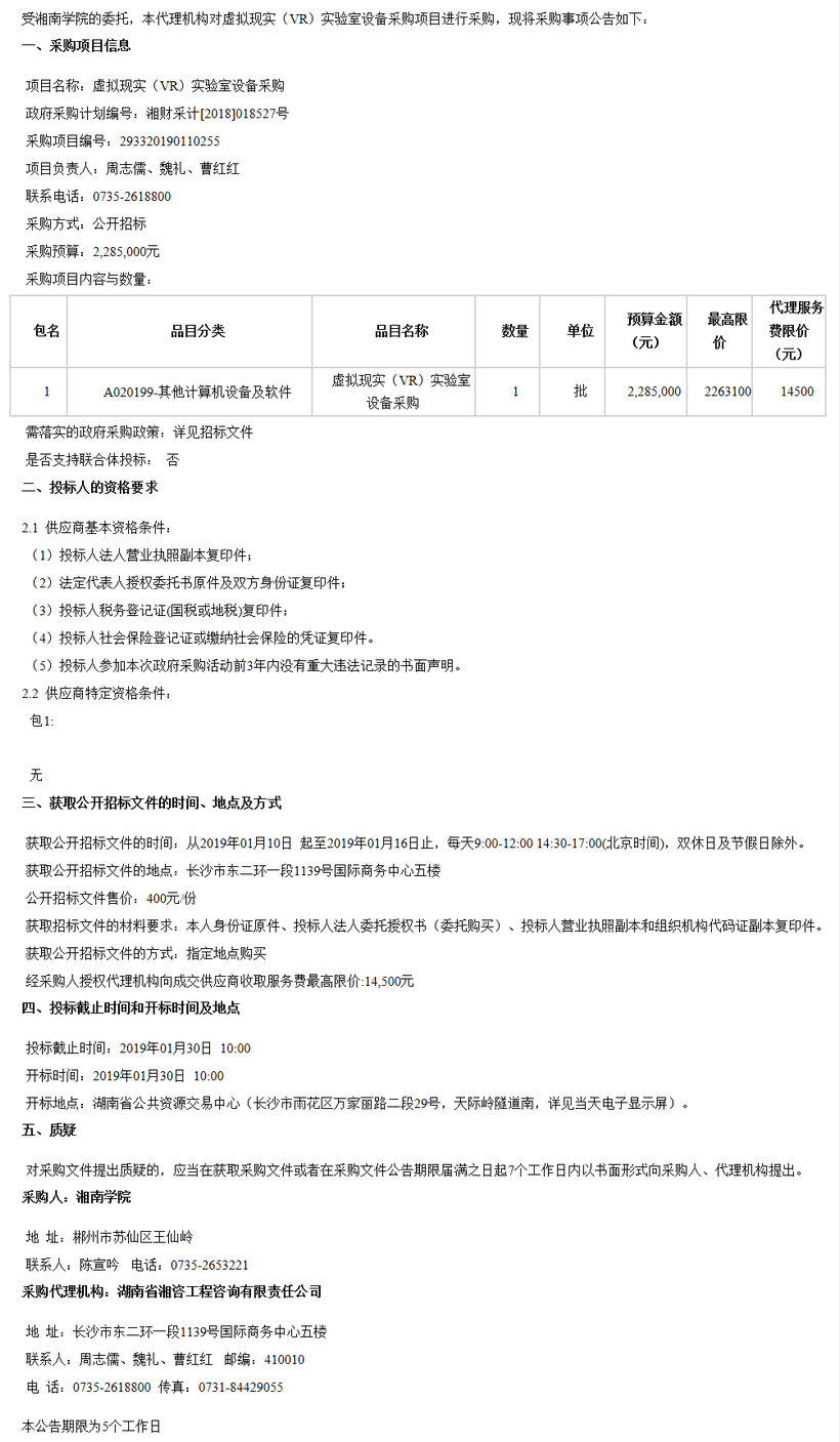 湘南學院虛擬現(xiàn)實(VR)實驗室設備采購項目公開招標公告