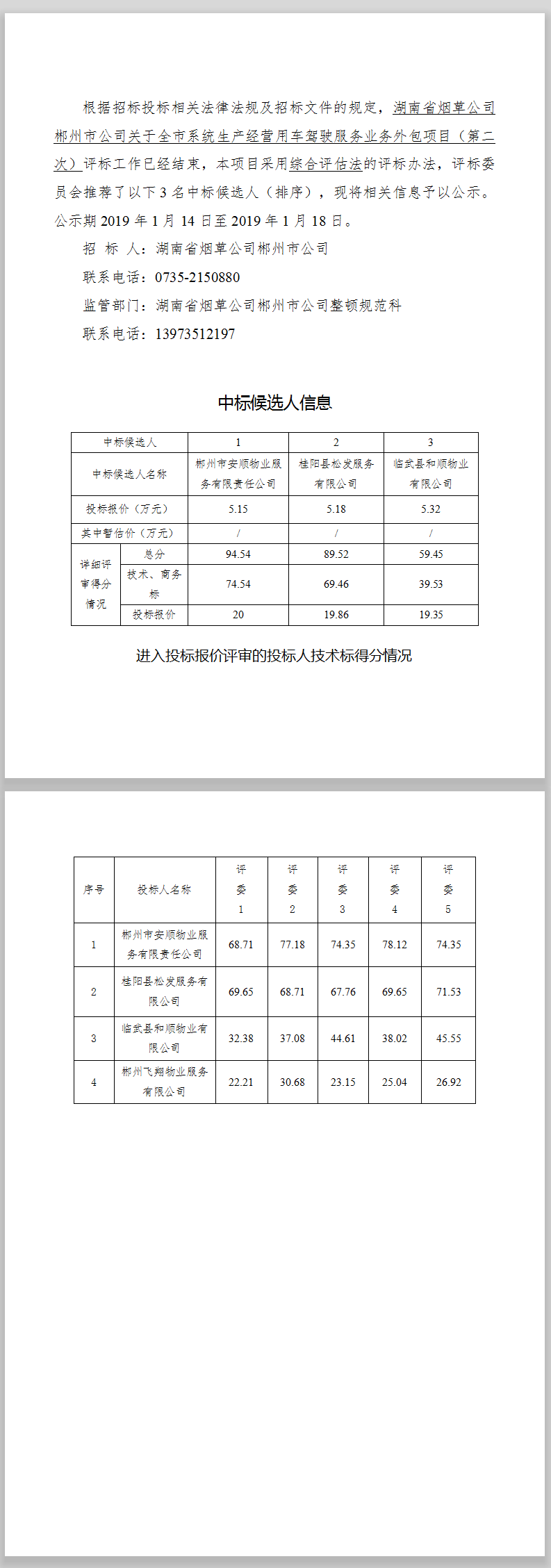 湖南省煙草公司郴州市公司關于全市系統(tǒng)生產(chǎn)經(jīng)營用車駕駛服務業(yè)務外包項目(第二次)中標候選人公示