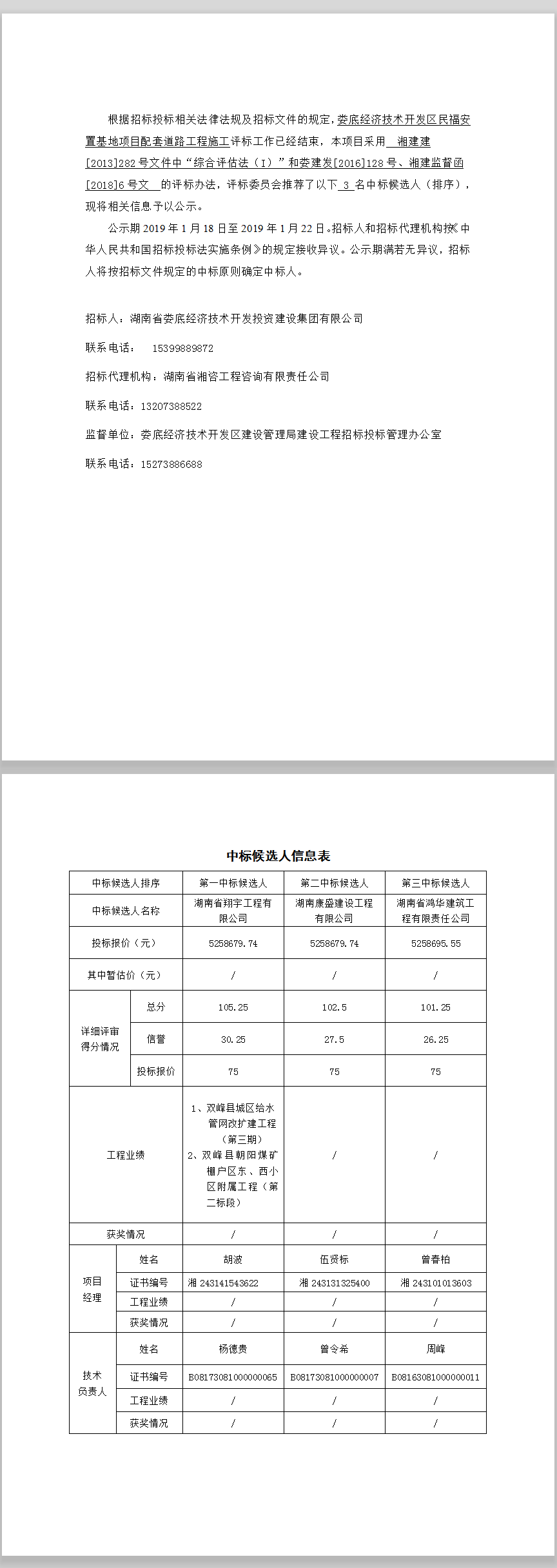婁底經(jīng)濟技術開發(fā)區(qū)民福安置基地項目配套道路工程施工中標候選人公示